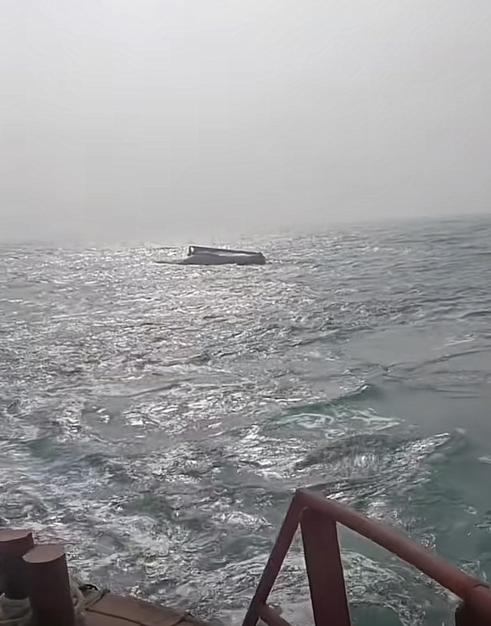 据网友发布的视频显示,一只货船船体倒扣在海面上,船桨露在海面,旁边有一艘轮船,疑似已展开救援。在评论区,该视频发布者回应称,事发时是11月2日凌晨4时多,出事船只为货船。