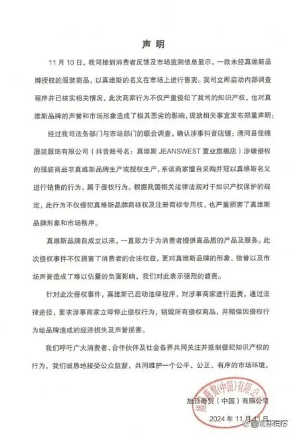 声明显示,涉事抖音店铺为清河县佳绵服装服饰有限公司(抖音账号名:真维斯JEANSWEST置业旗舰店)。