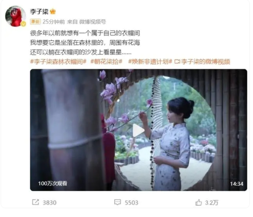 随后,她又发布了一则视频称:“很多年以前就想有一个属于自己的衣帽间,我想要它是坐落在森林里的,周围有花海,还可以躺在衣帽间的沙发上看星星。”此条视频播放量目前已破2700万。