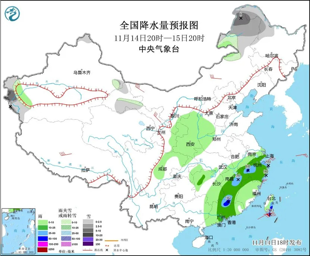 中央气象台预计,14日20时至15日20时,内蒙古东部、黑龙江西北部、新疆南疆西部山区、甘肃祁连山区等地部分地区有小雪或雨夹雪,其中,内蒙古东北部、黑龙江西北部、新疆南疆西部山区等地部分地区有中到大雪,新疆南疆西部山区局地暴雪。江西南部、浙江西部和东部沿海、广东北部、台湾岛东南部等地部分地区有暴雨,台湾岛东南部局地大暴雨。