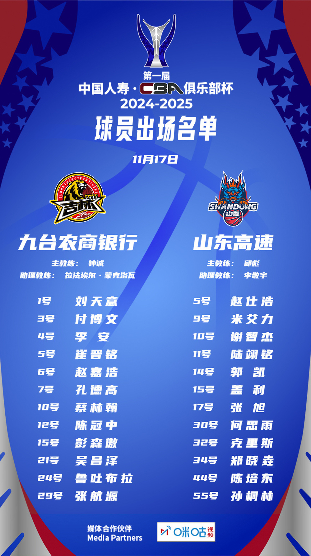 吉林队:李安7分、崔晋铭5分3助攻、吴昌泽7分3篮板、蔡林翰14分、陈冠中7分、付博文7分4助攻2抢断、鲁吐布拉6分2篮板、刘天意15分、赵嘉浩11分7篮板