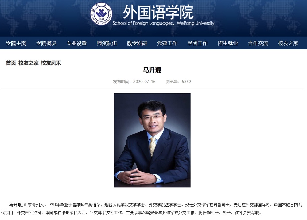 潍坊学院外国语学院网站显示,马升琨1991年毕业于昌潍师专英语系,是外国语学院1989级校友,山东青州人,现任外交部军控司副司长。先后在外交部国际司、中国常驻日内瓦代表团、外交部军控司、中国常驻维也纳代表团、外交部军控司工作,历任副处长、处长、驻外参赞等职。