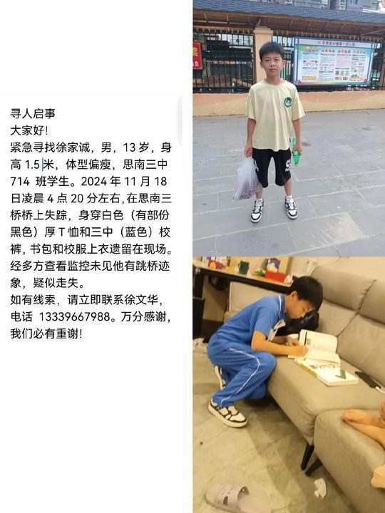 寻人启事内容显示,徐家诚,男,13岁,身高1.5米,体型偏瘦,思南三中714班学生。2024年11月18日凌晨4点20分左右,在思南三桥桥上失踪,身穿白色(有部分黑色)厚T恤和三中(蓝色)校裤,书包和校服上衣遗留在现场。经多方查看监控未见有跳桥迹象,疑似走失。