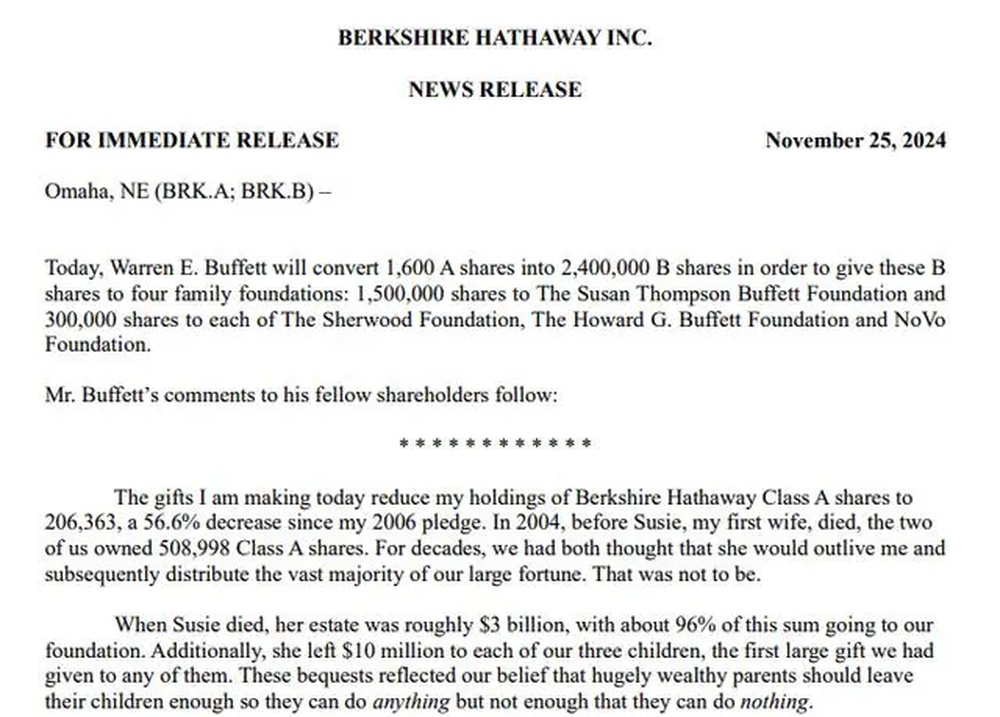 具体的细节也与去年的“感恩节捐款”一致:150万股捐赠给由他前妻命名的苏珊·汤普森·巴菲特基金会,3个巴菲特子女的基金会各得到30万股。