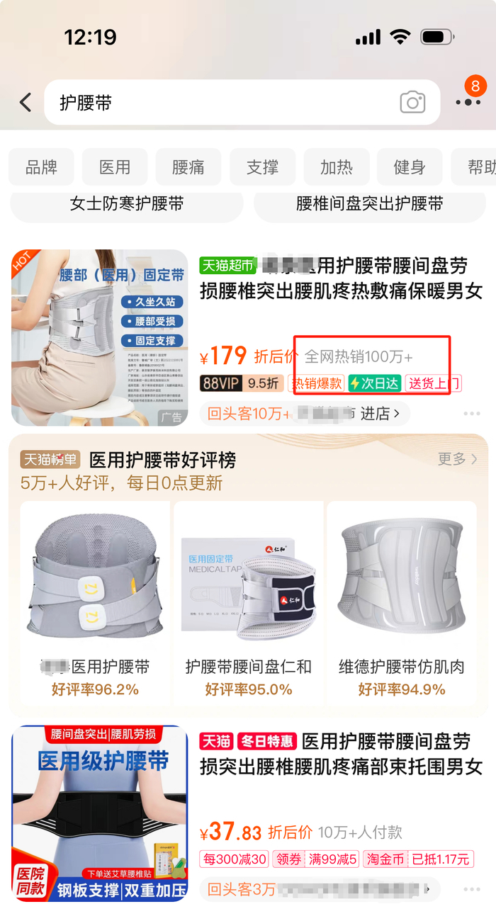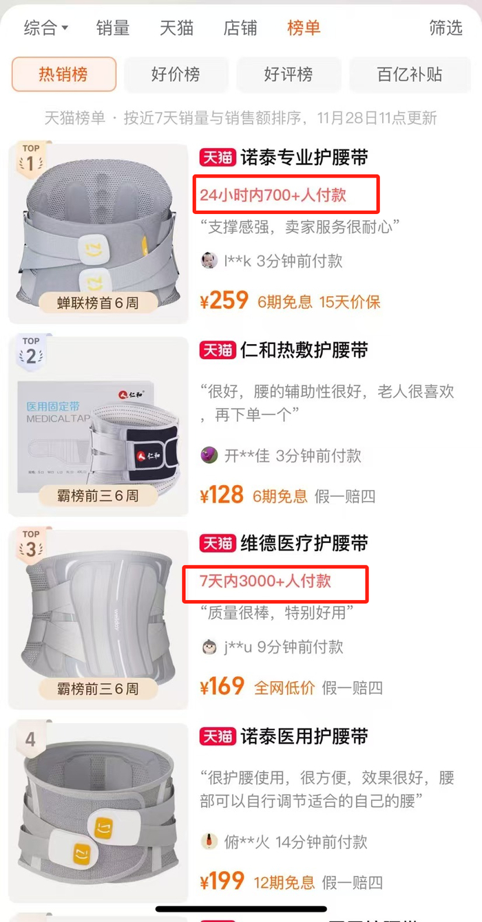 记者在某电商平台检索“护腰带”发现,护腰带的价格在59元至300元之间不等,部分产品全网热销超100万。天猫榜单医用护腰带热销榜显示,有品牌七天内成交量超3000单。据商品详情页介绍,护腰带主要从支撑、减压、防护、理疗全面对抗腰痛,利用医学原理结构辅助腰部发力,升级版更配有热敷袋促进血液循环,更加适合腰部寒凉、腰疼腰肌劳损人群。“腰疼时刻,立享舒适”的宣传语更是吸引了不少“腰痛青年”。