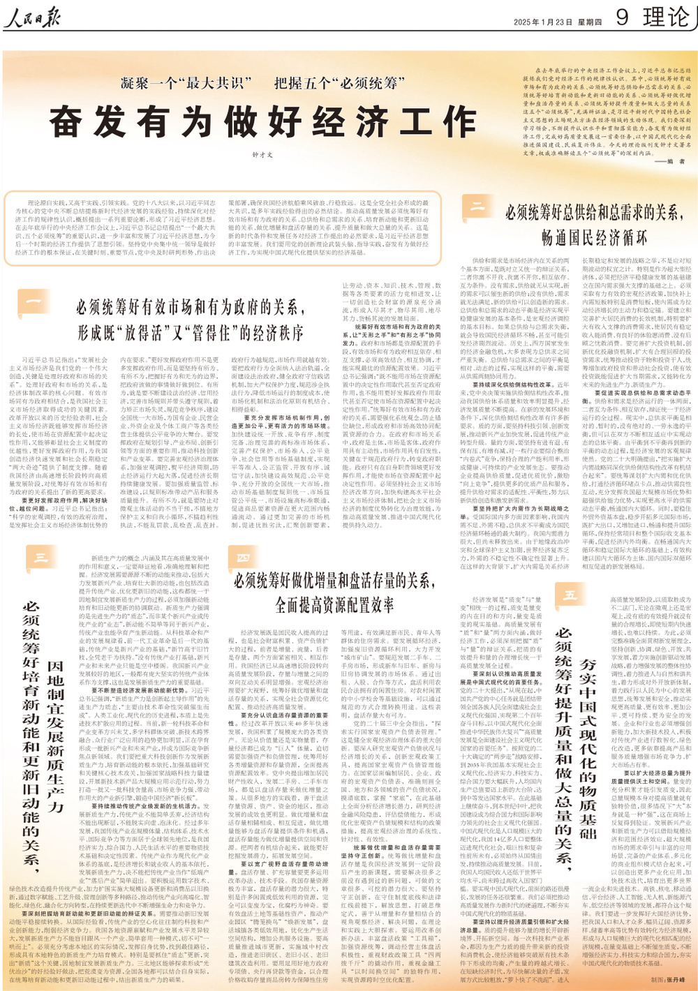 在去年底举行的中央经济工作会议上,习近平总书记总结提炼我们党对经济工作的规律性认识。其中,必须统筹好有效市场和有为政府的关系、必须统筹好总供给和总需求的关系、必须统筹好培育新动能和更新旧动能的关系、必须统筹好做优增量和盘活存量的关系、必须统筹好提升质量和做大总量的关系这五个“必须统筹”,充满辩证法,是习近平新时代中国特色社会主义思想的立场观点方法在经济领域的生动体现。我们要深刻学习领会,不断提升认识水平和贯彻落实能力,奋发有为做好经济工作,完成好高质量发展这一首要任务,以中国式现代化全面推进强国建设、民族复兴伟业。今天的理论版刊发钟才文署名文章,权威准确解读五个“必须统筹”的深刻内涵。