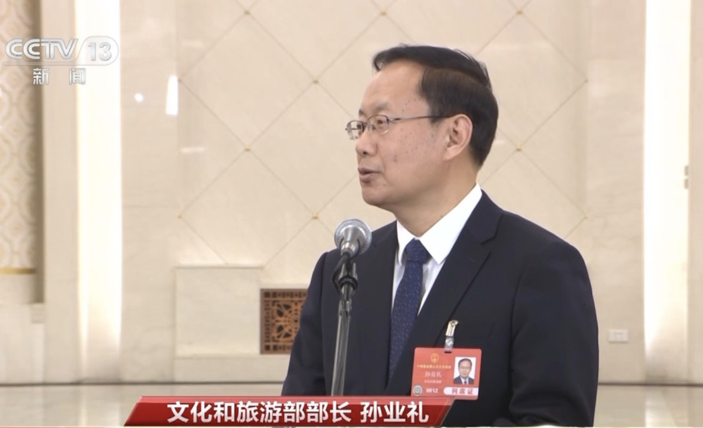 今天(3月11日),十四届全国人大三次会议第三场“部长通道”在人民大会堂举行,文化和旅游部部长孙业礼接受了中央广播电视总台记者采访。
