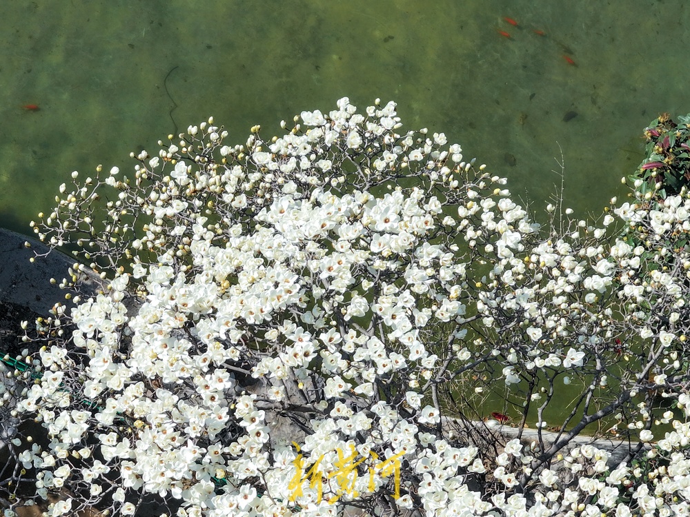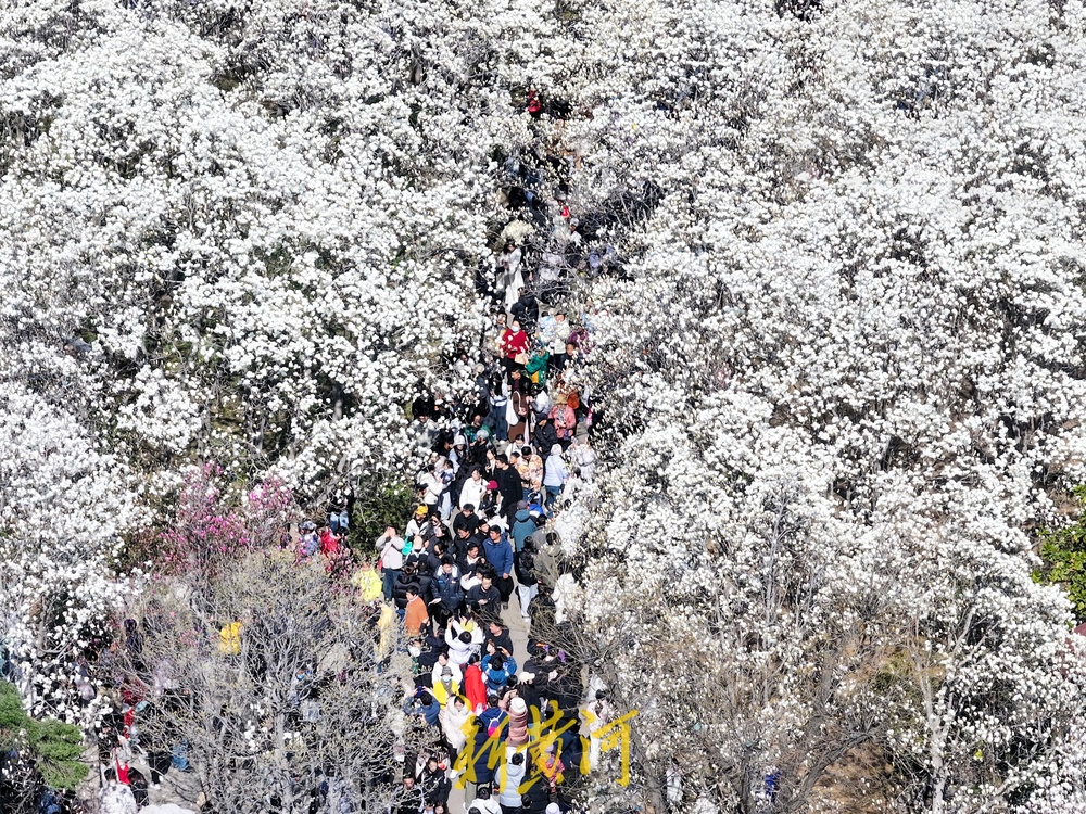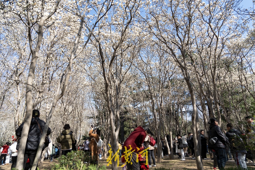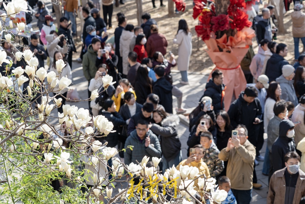 3月16日,公园内玉兰花大面积绽放,洁白如雪的花朵迎风摇曳,散发出阵阵清香,吸引了大批市民前来观赏。