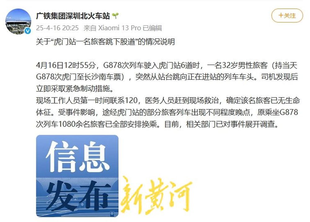 4月16日,@广铁集团深圳北火车站发布关于“虎门站一名旅客跳下股道”的情况说明:
