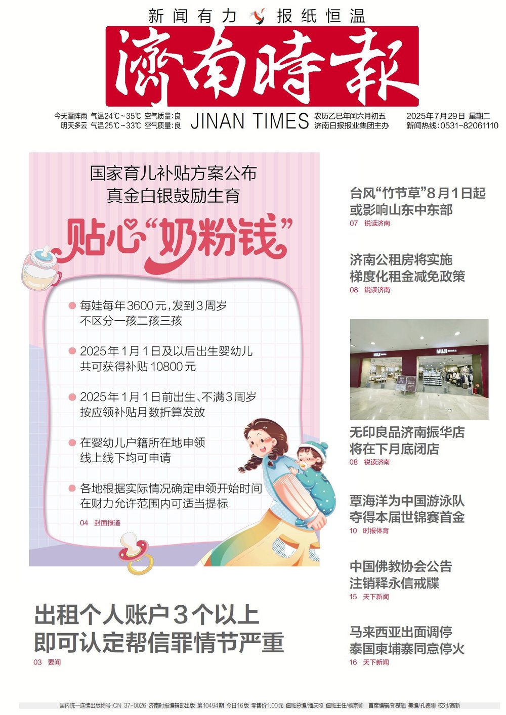 ●中共中央办公厅、国务院办公厅28日发布《育儿补贴制度实施方案》,自2025年1月1日起,对符合法律法规规定生育的3周岁以下婴幼儿发放补贴,每孩每年3600元,至其年满3周岁。