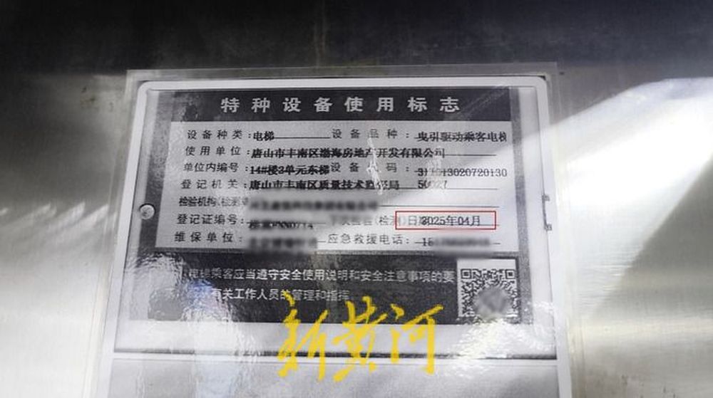 7月中旬,新黄河记者实地走访位于唐山市丰南区的白石家园小区。在该小区13号楼2单元,记者看到电梯内张贴的特种设备使用标志上显示“下次检验(检测)日期为2025年4月。”在轿厢一侧的河北省特种设备使用登记证上显示,该电梯为奥的斯电梯(中国)有限公司制造,登记日期为2013年5月8日。记者随机探访了几栋楼的电梯,看到轿厢内张贴的特种设备标志上均显示下次检验(检测)日期为2025年4月。