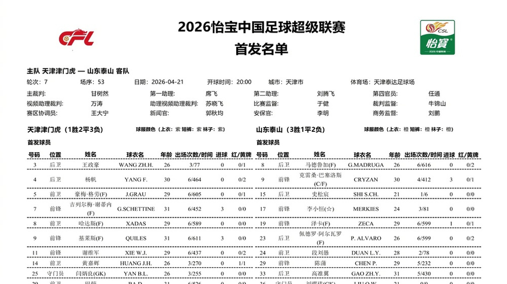 泰山队客战津门虎:段刘愚、刘骐玮首发,瓦科替补