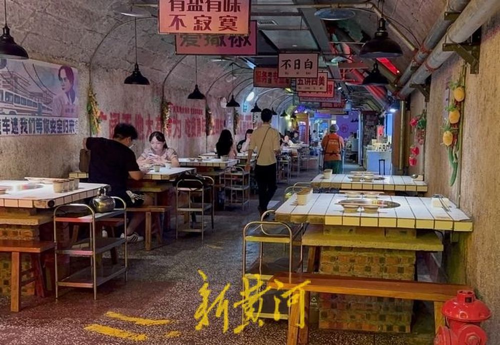 “欢迎光临防空洞老火锅”,正值中午,店员热情的喊叫声引来游客驻足。位于重庆渝中区菜园坝街道的“地道壹号火锅”是一家由防空洞改造而成的火锅店,从洞门口远远望去,狭长的洞穴一眼望不到头,进入洞内,有一片特殊的区域,据该店店员介绍,这是专门留出来供市民免费纳凉的地儿。沿着洞穴往里走,火锅的香味和食客的谈笑声飘荡在洞内,这座曾经历了战火与硝烟的防空洞如今感受到的是来自和平年代的人间烟火。这样的防空洞火锅在重庆不止一家,“洞子火锅”也成了重庆火锅的代名词。