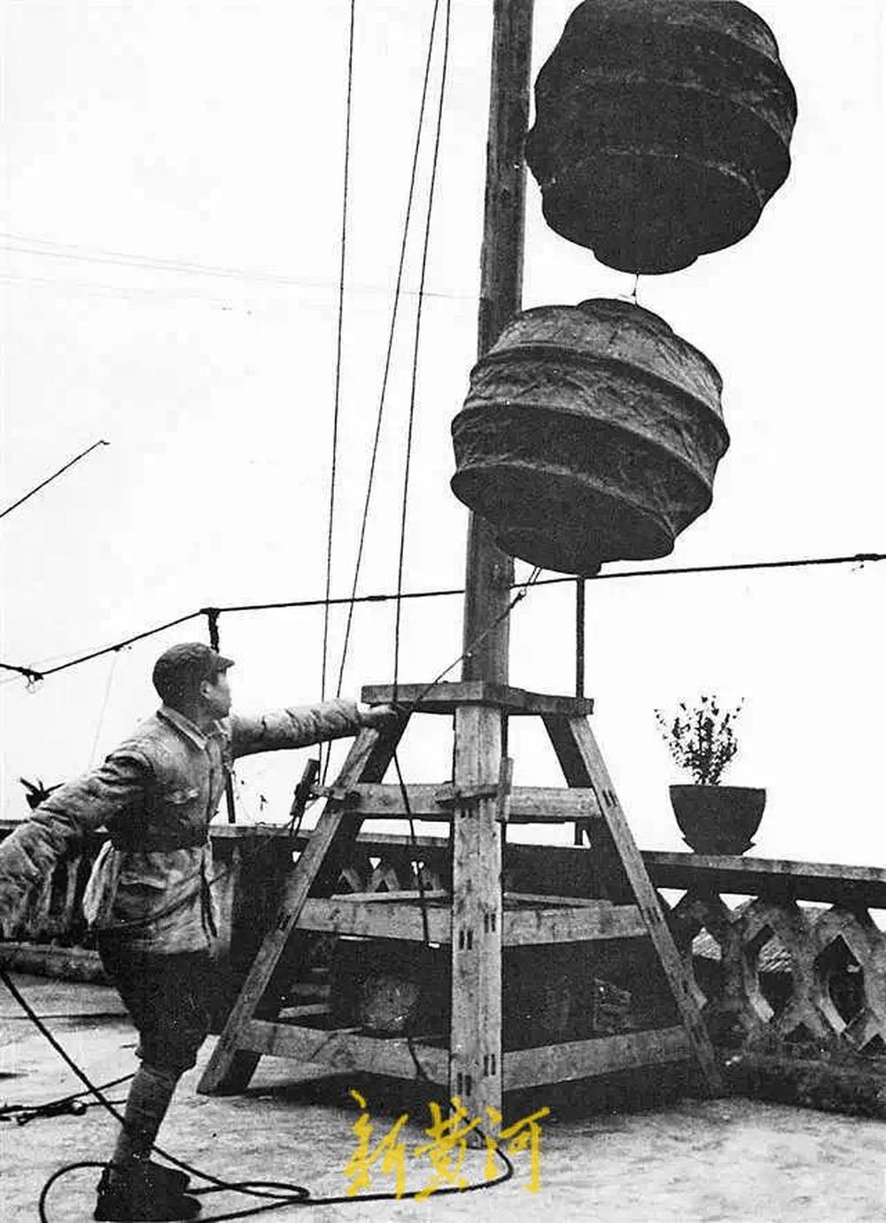 抗战时期,防空人员悬挂红色信号球用以防空示警(图片来源:重庆市国防动员办公室微信公众号)