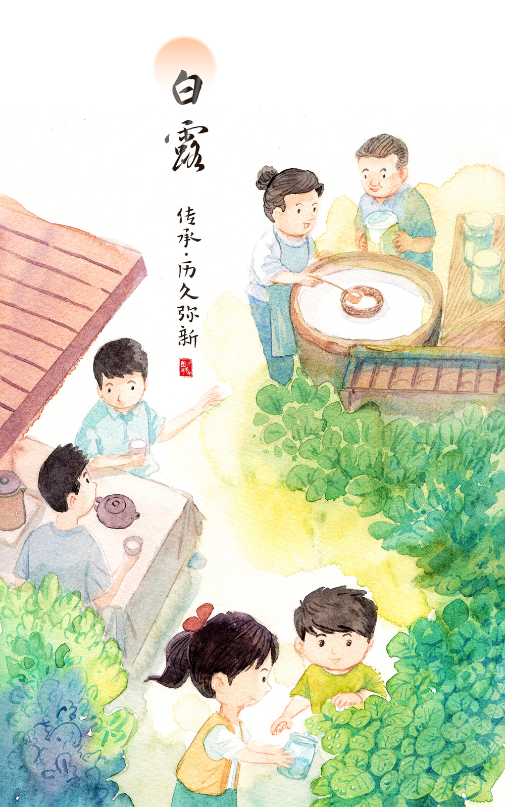 《月令七十二候集解》记载:“白露,八月节。秋属金,金色白,阴气渐重,露凝而白也。”白露是秋天的第三个节气,表示孟秋时节的结束和仲秋时节的开始。《南歌子·忆旧》说“白露收残暑,清风衬晚霞”,暑热在白露节气时消磨殆尽,秋天的凉气渐起,清晨的草叶上会出现白色露珠。