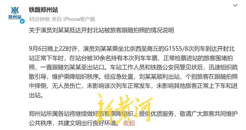 9月8日,@铁路郑州站 发布《关于演员刘某某抵达开封北站被旅客跟随拍照的情况说明》: