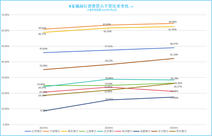 占比情况来看,宁波银行消费贷占个人贷款余额比重最高,2025年6月末为64.49%,在9家银行中占比最高,且近两年占比持续升高。南京银行的消费贷占比位居第二,为62.45%,仅次于宁波银行。