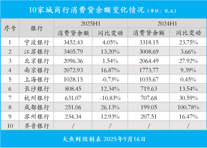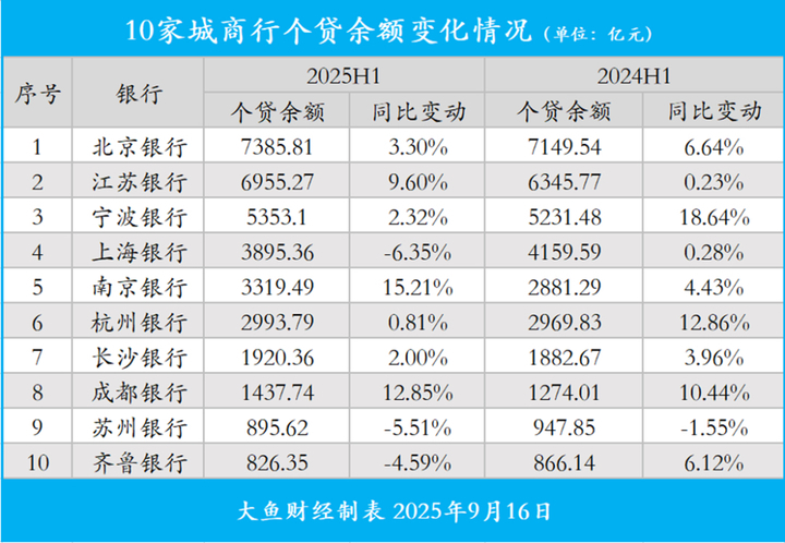 2025年上半年,北京银行、江苏银行、宁波银行个贷业务余额都达到了5000亿元以上。在10家银行中,上海银行、苏州银行以及齐鲁银行的个贷稍有下降以外,其余城商行的个贷业务均维持增长。