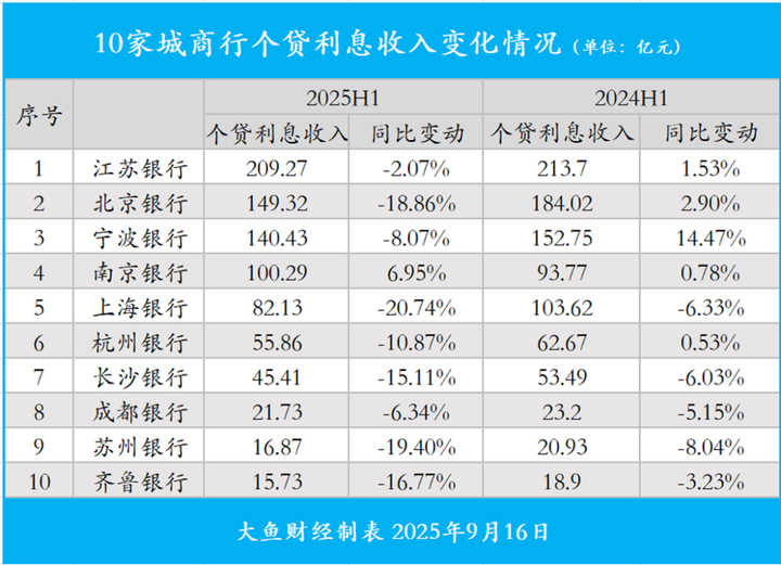 今年上半年,10家银行里,9家银行个贷利息收入均出现同比下滑,仅南京银行一家实现同比上升。