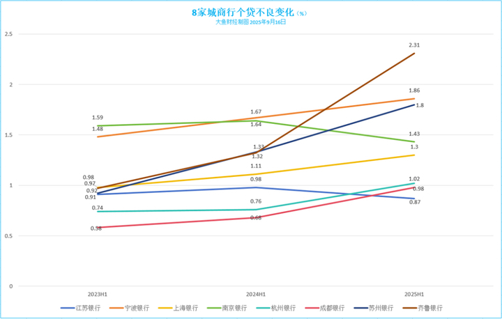 今年上半年,在8家公布个贷不良率的银行中,有6家银行的个贷不良率上升。齐鲁银行上半年末达到了2.31%,同比上升0.99个百分点;其次为宁波银行、苏州银行,个贷不良贷款率分别为1.86%、1.8%。