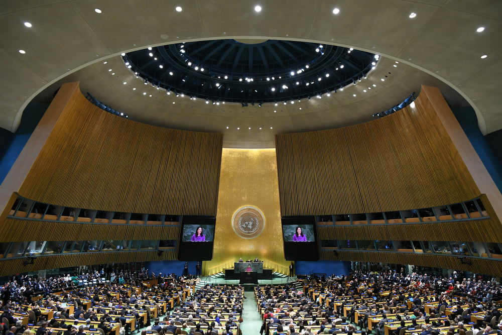 9月23日,在位于纽约的联合国总部,第80届联大主席贝尔伯克在第80届联合国大会一般性辩论开幕式上发言。 第80届联合国大会一般性辩论23日在纽约联合国总部拉开帷幕。 新华社记者李睿摄