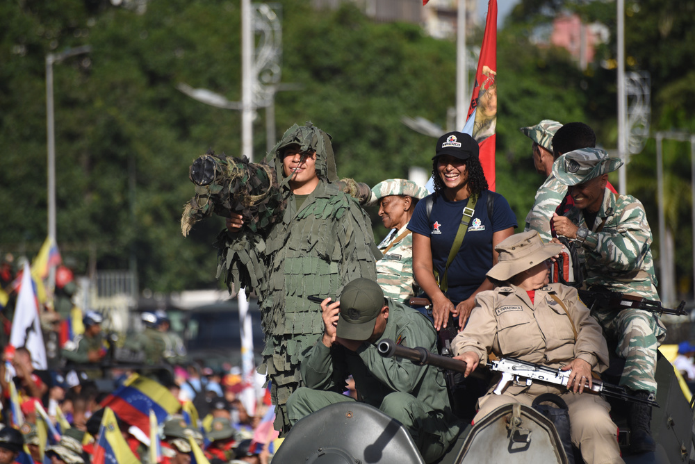 9月23日,在委内瑞拉首都加拉加斯,玻利瓦尔民兵组织成员携带武器参加游行。新华社发(马科斯·萨尔加多摄)