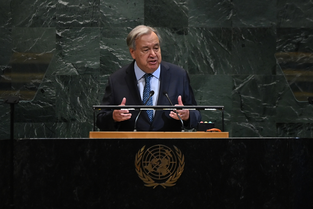 9月23日,在位于纽约的联合国总部,联合国秘书长古特雷斯在第80届联合国大会一般性辩论开幕式上致辞。 新华社记者李睿摄