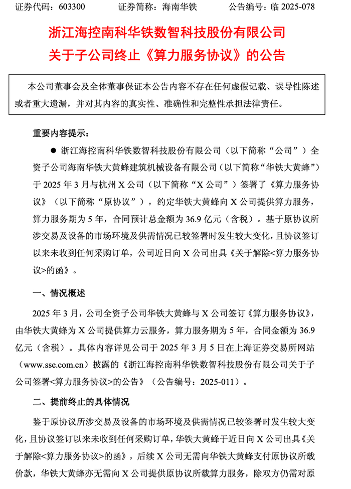 9月30日,海南华铁(证券代码:603300)发布公告称,其全资子公司海南华铁大黄蜂建筑机械设备有限公司与杭州某公司(公告中隐去具体名称,以“X公司”代称)于今年3月签署的《算力服务协议》已经终止。这份原本为期5年、总金额高达36.9亿元的合同,在喧嚣登场后悄然落幕。