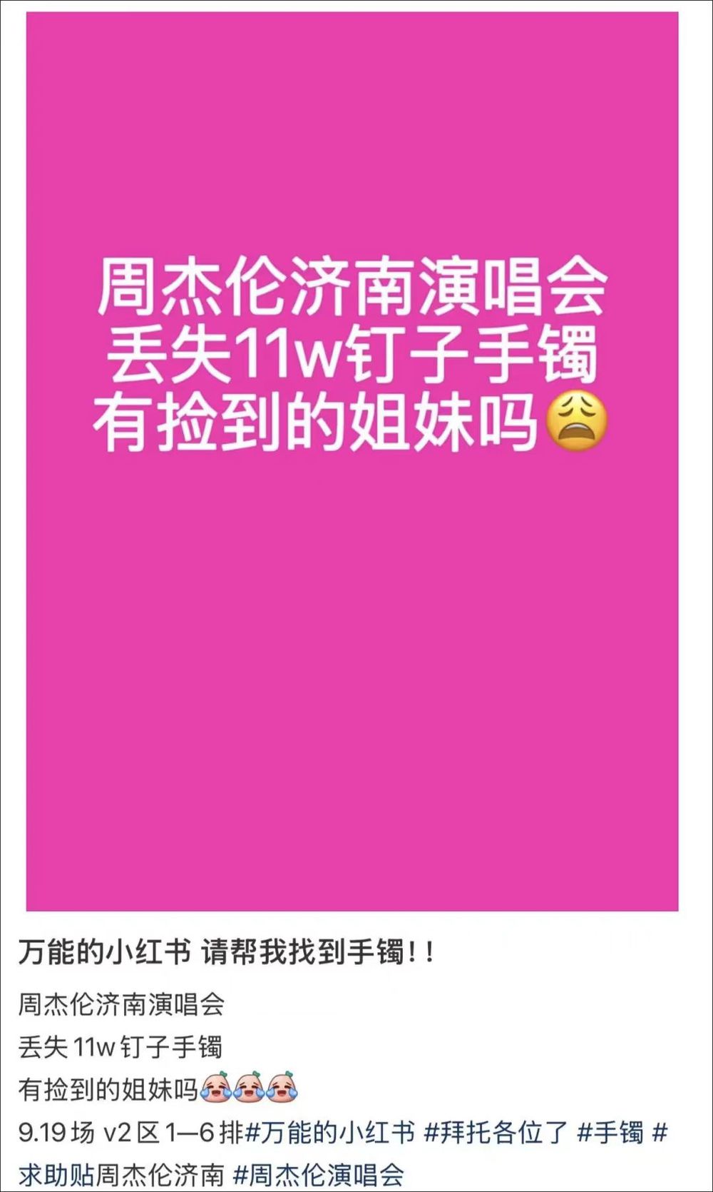 9月25日,山东周女士在社交媒体发帖称在现场丢了价值11万元的手镯,场馆工作人员帮忙寻找多次未果,在网络上求助:“周杰伦济南演唱会,丢失11w钉子手镯,有捡到的姐妹吗?9.19场。”