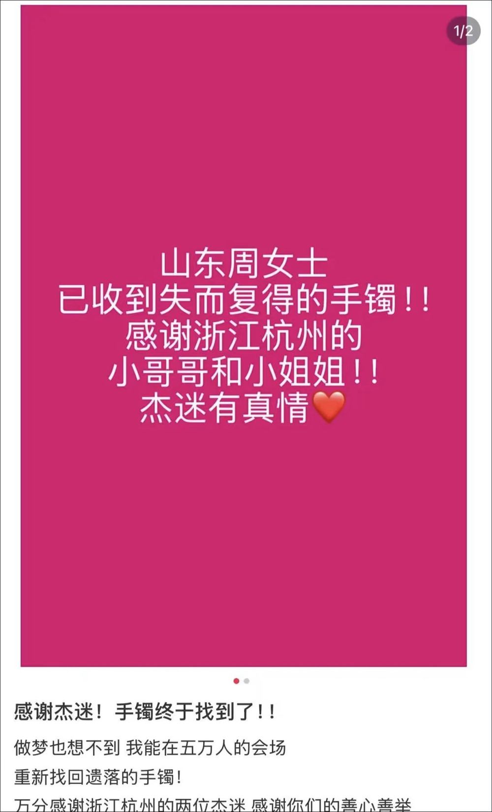 4天前,周女士再次发文,已拿到手镯并表示感谢:“做梦也想不到,我能在五万人的会场重新找回遗落的手镯!万分感谢浙江杭州的两位杰迷,感谢你们的善心善举。感谢所有评论区网友帮我助力,感谢杰迷,感谢周杰伦,感谢自带拾金不昧buff的杰伦演唱会!”