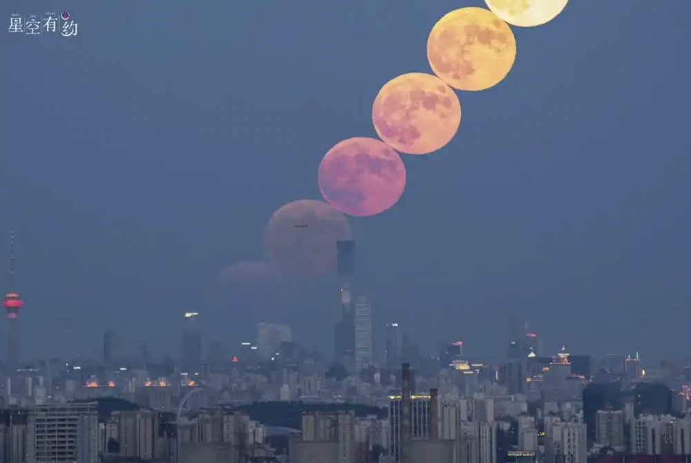 由于地球自转,月亮是东升西落。通常,月亮刚升起或即将落下时,其与地面的相对位置较低,适合通过前景元素增加照片的层次感和深度,拍摄景物和一轮明月的“合影”。如果你能用上长焦镜头配单反相机,或是变焦范围很大的手机,拍出这样的照片并不难。
