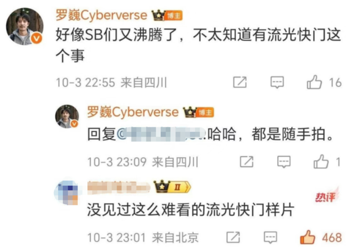 10月3日,荣耀首席影像工程师罗巍在个人社交媒体上发布了多张荣耀Magic8 Pro拍摄的夜景照片,并着重介绍了15秒手持流光快门照片的防抖能力。然而,有网友对照片质量提出疑问,认为拍摄效果不佳。面对质疑,罗巍言辞激烈地予以回应,称“好像SB们又沸腾了,不太知道流光快门这个事”。