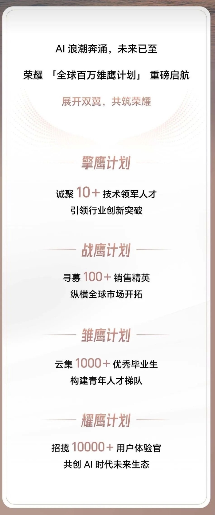 今年以来,荣耀在多方面进行了调整与变革。第二季度,荣耀启动“雄鹰计划”,对中国区销售与服务等部门人员进行调整,38个关键岗位主管重新竞聘上岗。5月底,又开启了“全球百万雄鹰计划”,面向全球招募技术领军人才、销售精英、优秀毕业生及用户体验官。