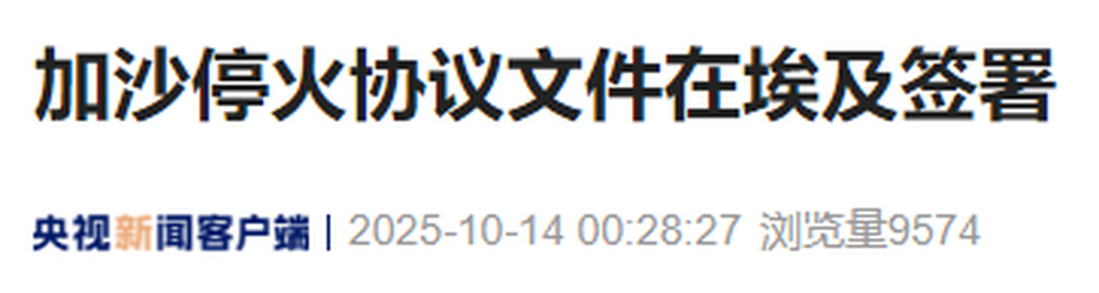 当地时间10月13日,美国、埃及、卡塔尔和土耳其在埃及沙姆沙伊赫签署了关于加沙停火协议的文件。
