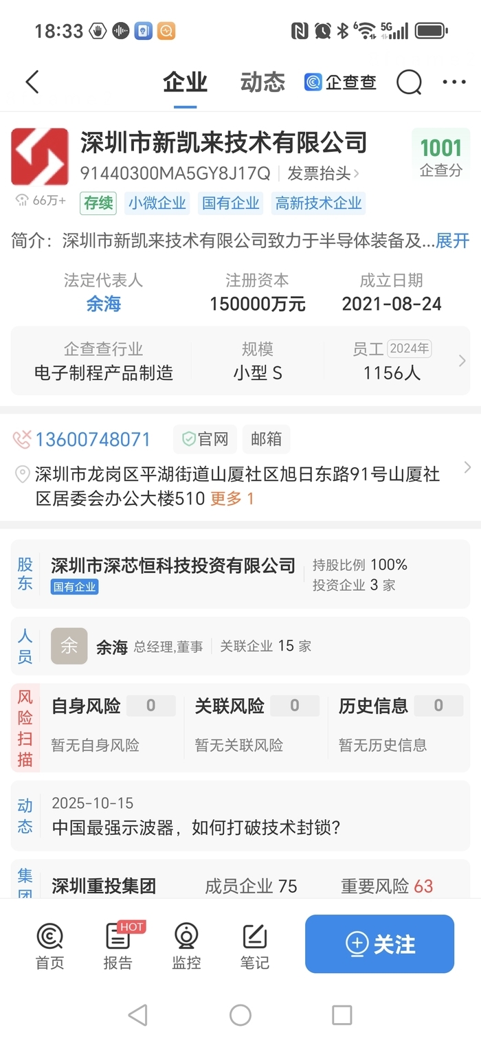 企查查显示,新凯来2021年8月在深圳龙岗区注册成立,注册资本15亿元,法定代表人余海,是一家致力于半导体装备及零部件、电子制造设备的研发、制造、销售与服务的公司,相关产品广泛应用于国内顶级制造企业和研究、测试机构。
