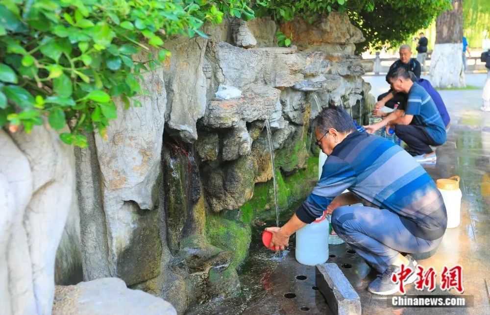 游客专门接泉水品尝,