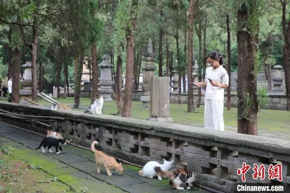 游客在《黑神话:悟空》取景地四门塔风景区逗猫,该景区也被称为“猫猫寺”。中新社记者 王采怡 摄