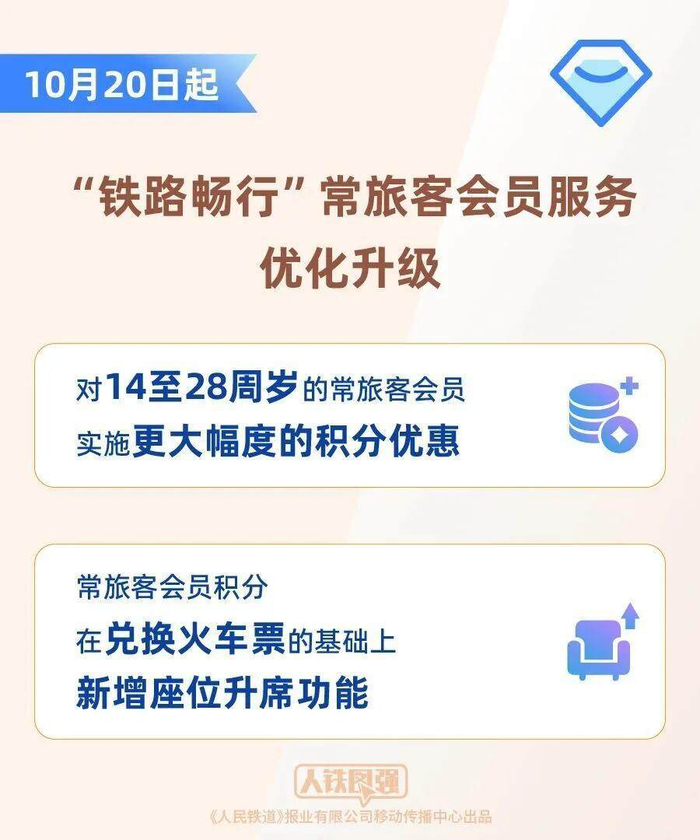 10月20日起,中国国家铁路集团有限公司将优化升级“铁路畅行”常旅客会员服务,对14至28周岁持居民身份证、港澳台居民居住证、港澳居民来往内地通行证、台湾居民来往大陆通行证、外国人永久居留身份证的常旅客会员实施更大幅度的积分优惠,会员积分在兑换火车票的基础上,新增座位升席功能,常旅客会员积分的应用场景进一步拓展,旅客将获得更多实惠,有利于激发“铁路+”消费潜力,促进人员流动和沿线经济发展,为全面扩大内需注入新动能。