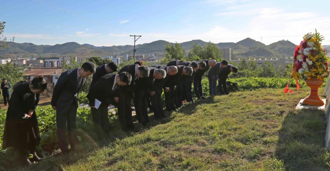 王大使一行向纪念塔献花篮并鞠躬默哀、献花祭酒,表达对志愿军英烈的崇高敬意和深切缅怀。随后,王大使一行赴纪念塔拟迁建地江东郡中国人民志愿军烈士陵园祭扫,并同朝方就纪念塔迁建位置等进行了交流。