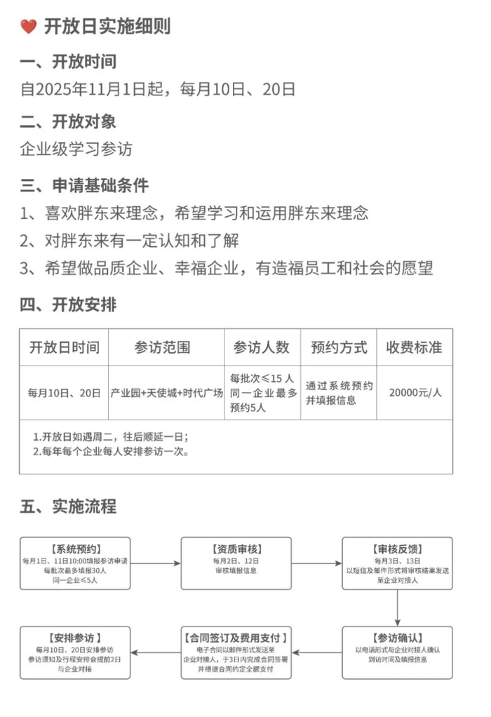 申请对象被严格限定为“企业级学习参访”,且必须满足三大基础条件:“喜欢胖东来理念”“对胖东来有一定认知和了解”以及“希望做品质企业、幸福企业”。