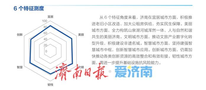 在这份报告中,济南在“宜居城市”排第二,“韧性城市”排第六,“文明城市”排第八,“智慧城市”排第九,“创新城市”排第十。