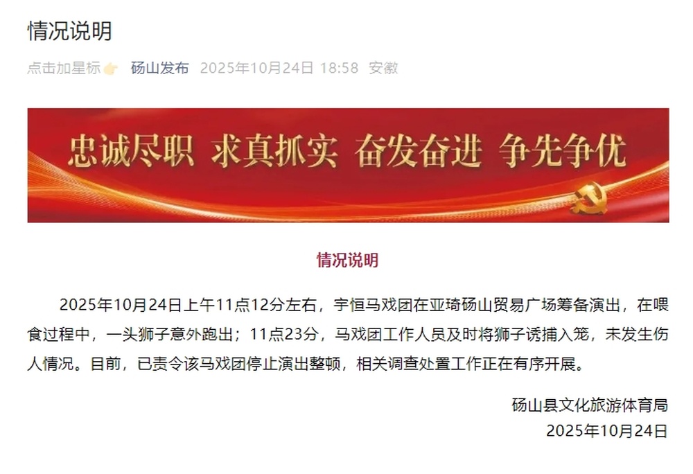 2025年10月24日上午11点12分左右,宇恒马戏团在亚琦砀山贸易广场筹备演出,在喂食过程中,一头狮子意外跑出;11点23分,马戏团工作人员及时将狮子诱捕入笼,未发生伤人情况。目前,已责令该马戏团停止演出整顿,相关调查处置工作正在有序开展。