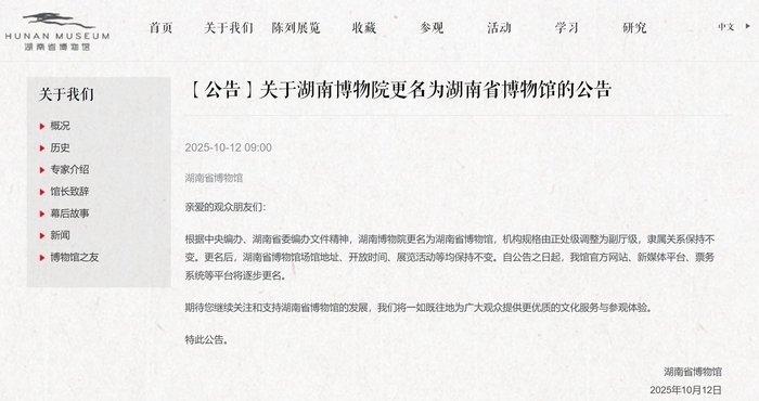 10月12日,湖南省博物馆发布《关于湖南博物院更名为湖南省博物馆的公告》,公告称:“根中央编办、湖南省委编办文件精神,湖南博物院更名为湖南省博物馆,机构规格由正处级调整为副厅级,隶属关系保持不变。更名后,湖南省博物馆场馆地址、开放时间、展览活动等均保持不变。自公告之日起,我馆官方网站、新媒体平台、票务系统等平台将逐步更名。 ”