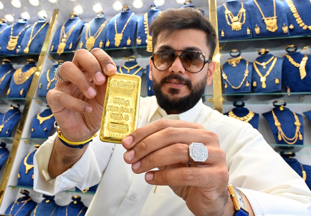 10月23日,在科威特首都科威特城,一名男子在金店内展示500克的金条。 近期,国际金价波动加剧。新华社发(阿萨德摄)