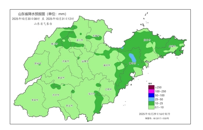 山东省气象台10月29日16时15分发布重要天气预报:受高空槽影响,预计10月30日白天到31日上午,我省自北向南有一次较明显降雨天气过程,降雨集中时段在30日夜间,全省累积平均降水量5~10毫米,其中,烟台、威海、青岛、潍坊、临沂和日照有小到中雨局部大雨(6~17毫米,局部25~35毫米),其他地区有小雨局部中雨(2~6毫米,局部10~20毫米)。