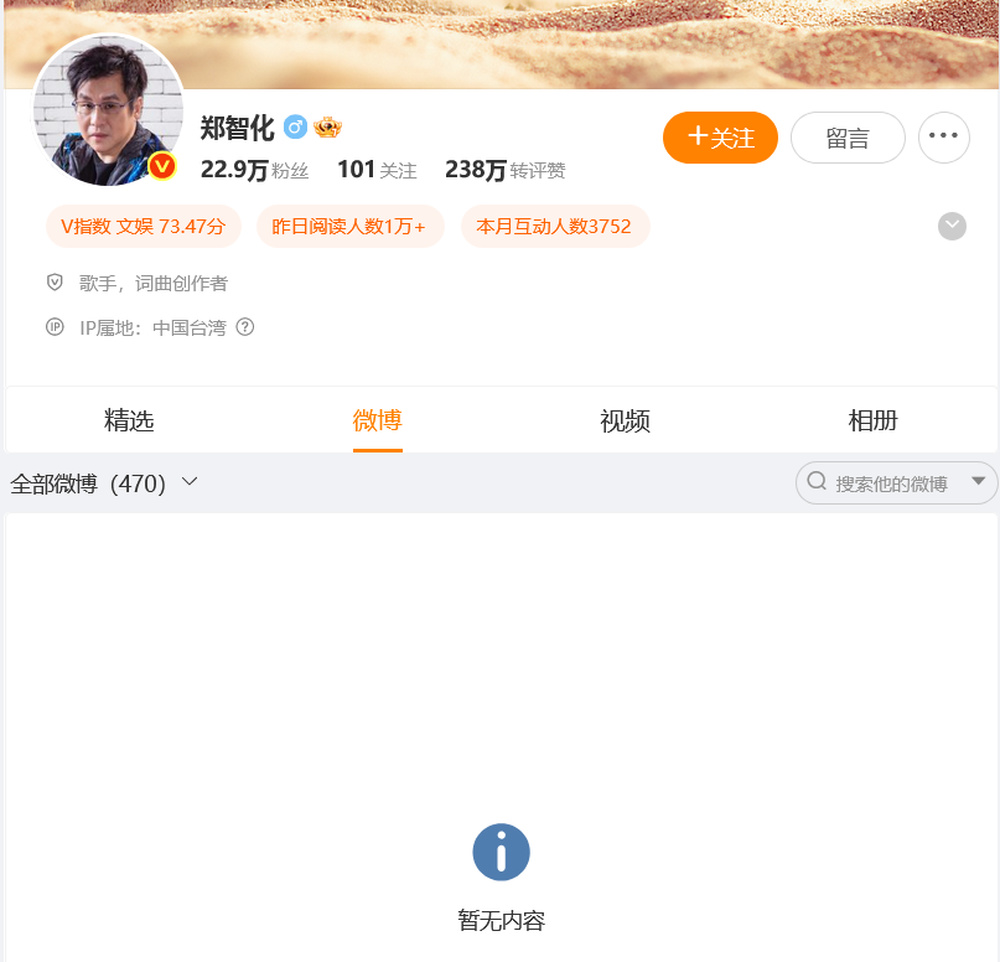 据多家媒体报道,11月3日,据页面显示,歌手郑智化微博已清空。