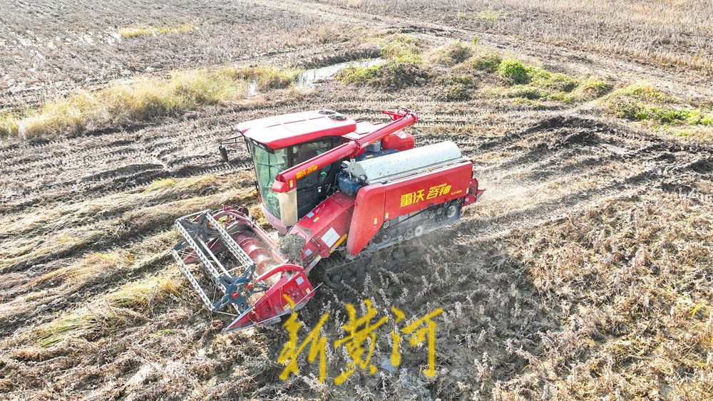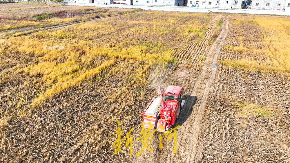 11月4日,深秋时节,济南美里北路的农田里一派繁忙景象。两台联合收割机在金色的黄豆田里来回穿梭,收割机高效地吞入成熟的豆株,完成脱粒后的豆秆被整齐地吐出。