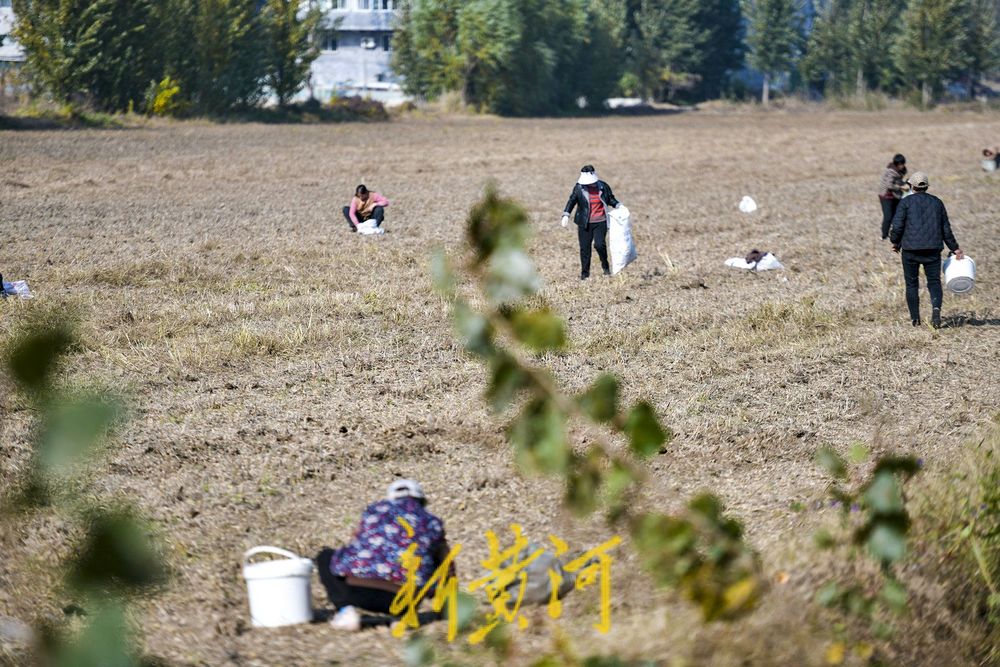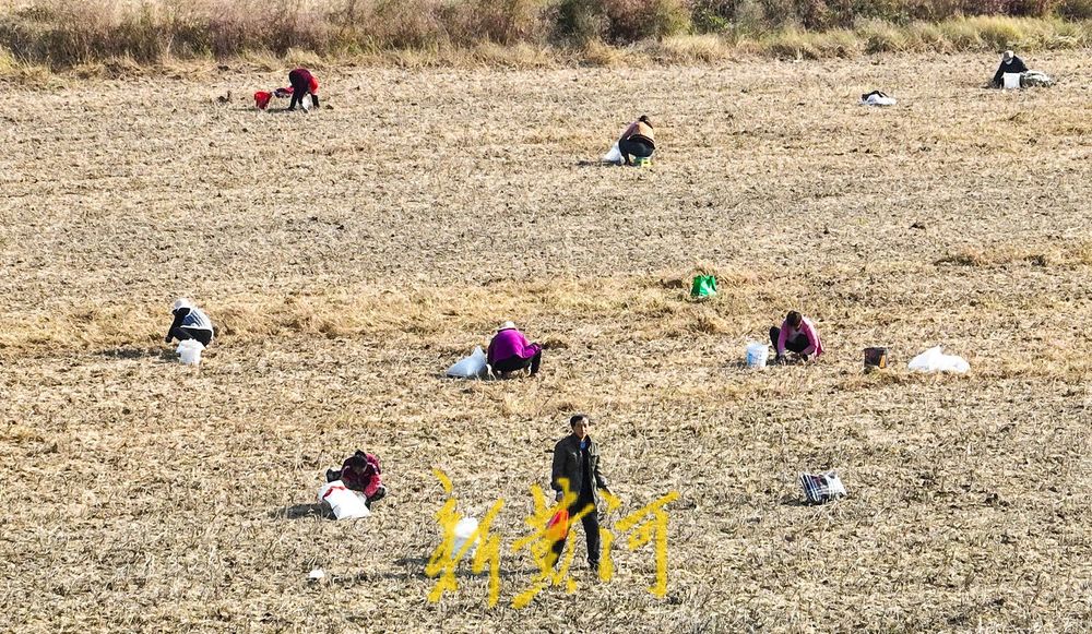众多村民紧随其后,在刚收割完的田地里弯腰拾穗,仔细捡拾机械收割过程中散落的豆荚,机械轰鸣与人工捡拾相辅相成,共同演绎着一场确保粮食颗粒归仓的秋收协奏曲。
