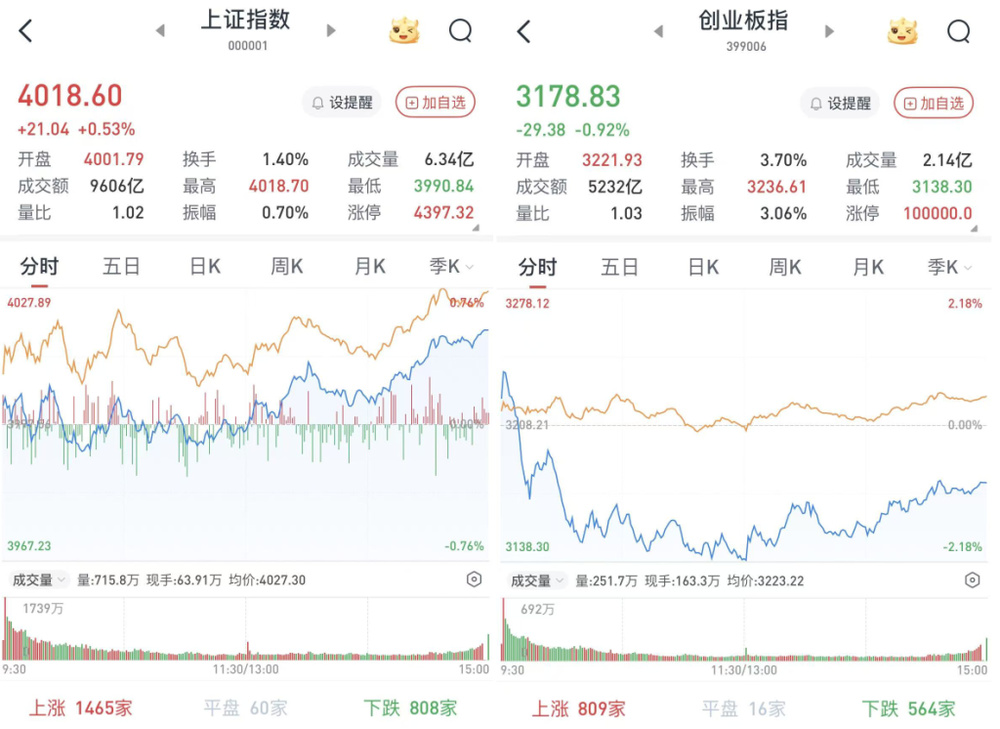 至收盘,上证综指涨0.53%,报4018.6点;科创50指数跌0.57%,报1407.56点;深证成指涨0.18%,报13427.61点;创业板指跌0.92%,报3178.83点。