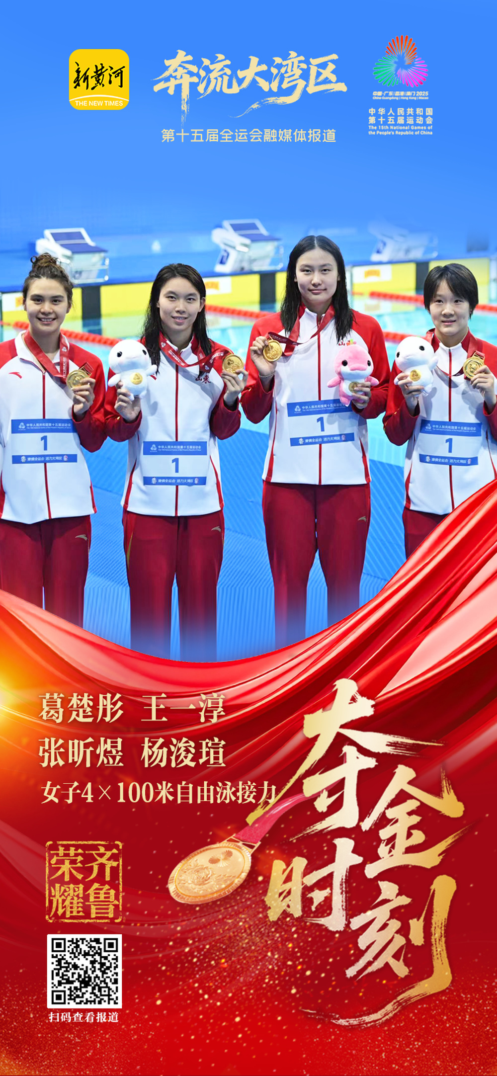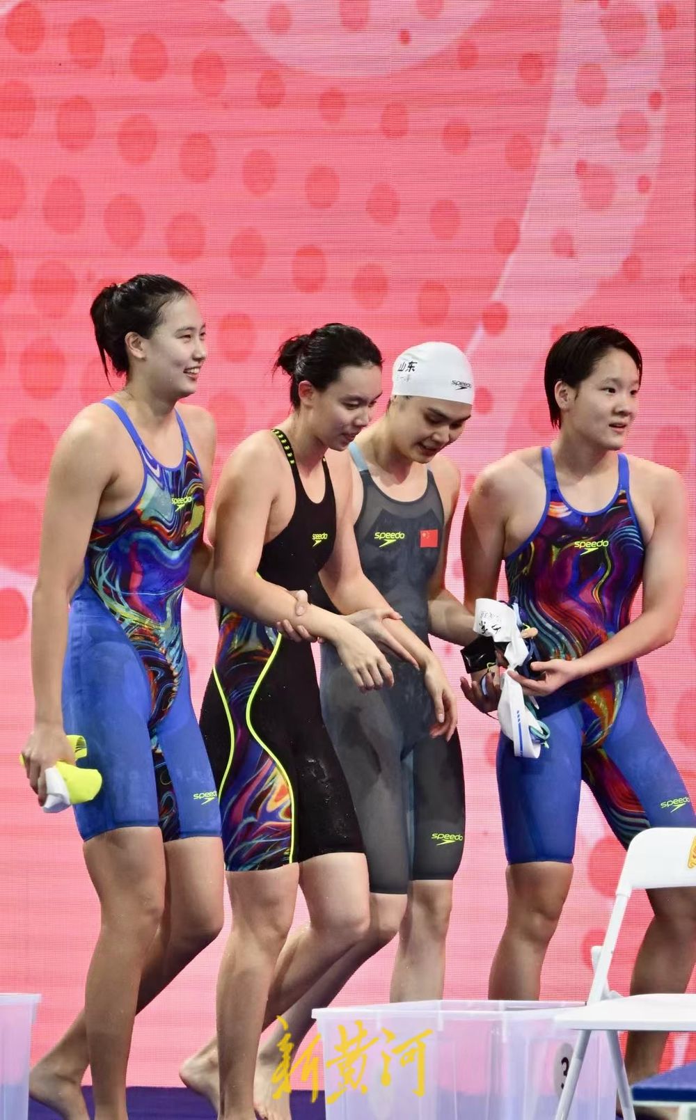 11月10日,第十五届全国运动会游泳女子4×100米自由泳接力决赛,山东游泳队葛楚彤、王一淳、张昕煜、杨浚瑄以3分36秒51的成绩夺冠。